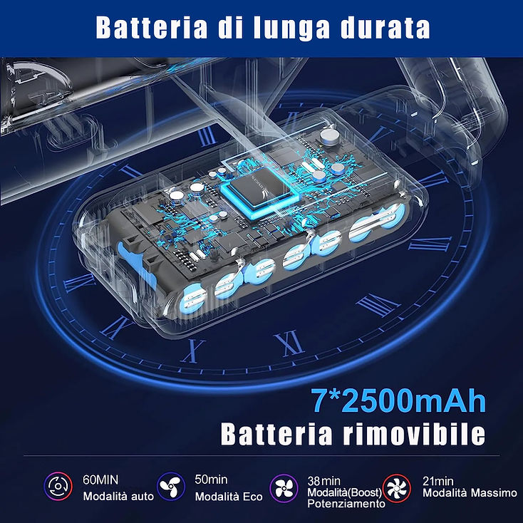 Batter-Fly Evo è dotato di 7 batterie al litio da 2500 mAh ad alta capacità che garantiscono un lungo tempo di pulizia fino a 60 minuti.